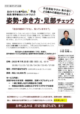 足のトラブル専門店【メディカルフットセンター】(西新宿)院長 小暮祐輔さん による、足と身体をチェック&トラブル解消のための運動指導を受けられるイベントです。