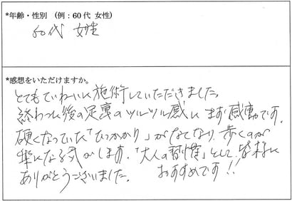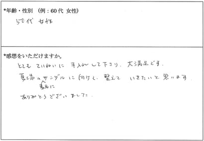 生まれかわったような足をキープするためのアドバイスもいただきましたが、ぜひまた施術もお願いしたいです。