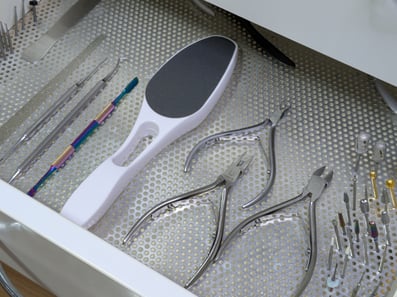 ・器具は基本的に耐水性のもののみ使用し、施術ごとに洗浄(超音波洗浄とブラシでのこすり洗いを併用)と浸漬除菌をします。保管の引き出しは紫外線滅菌機を兼ねています。